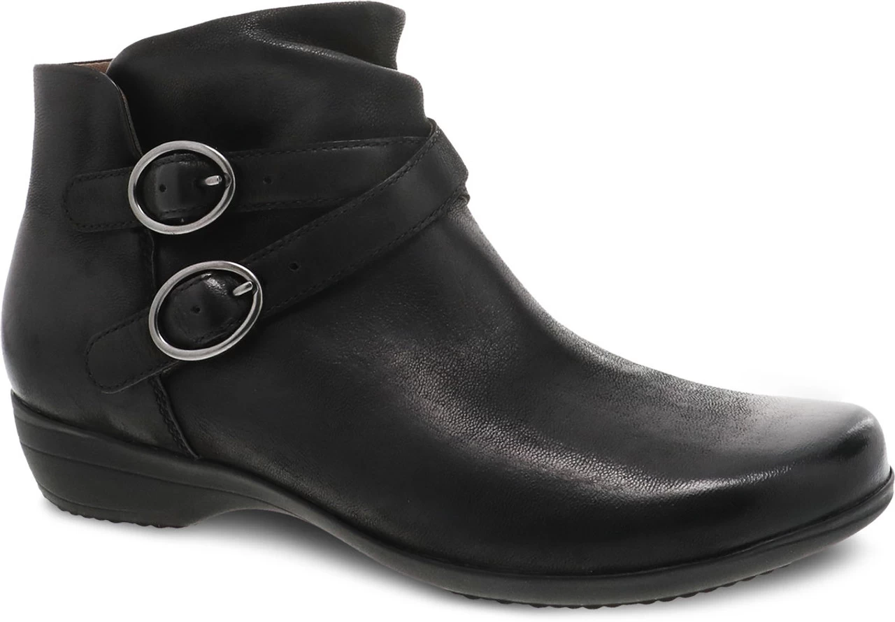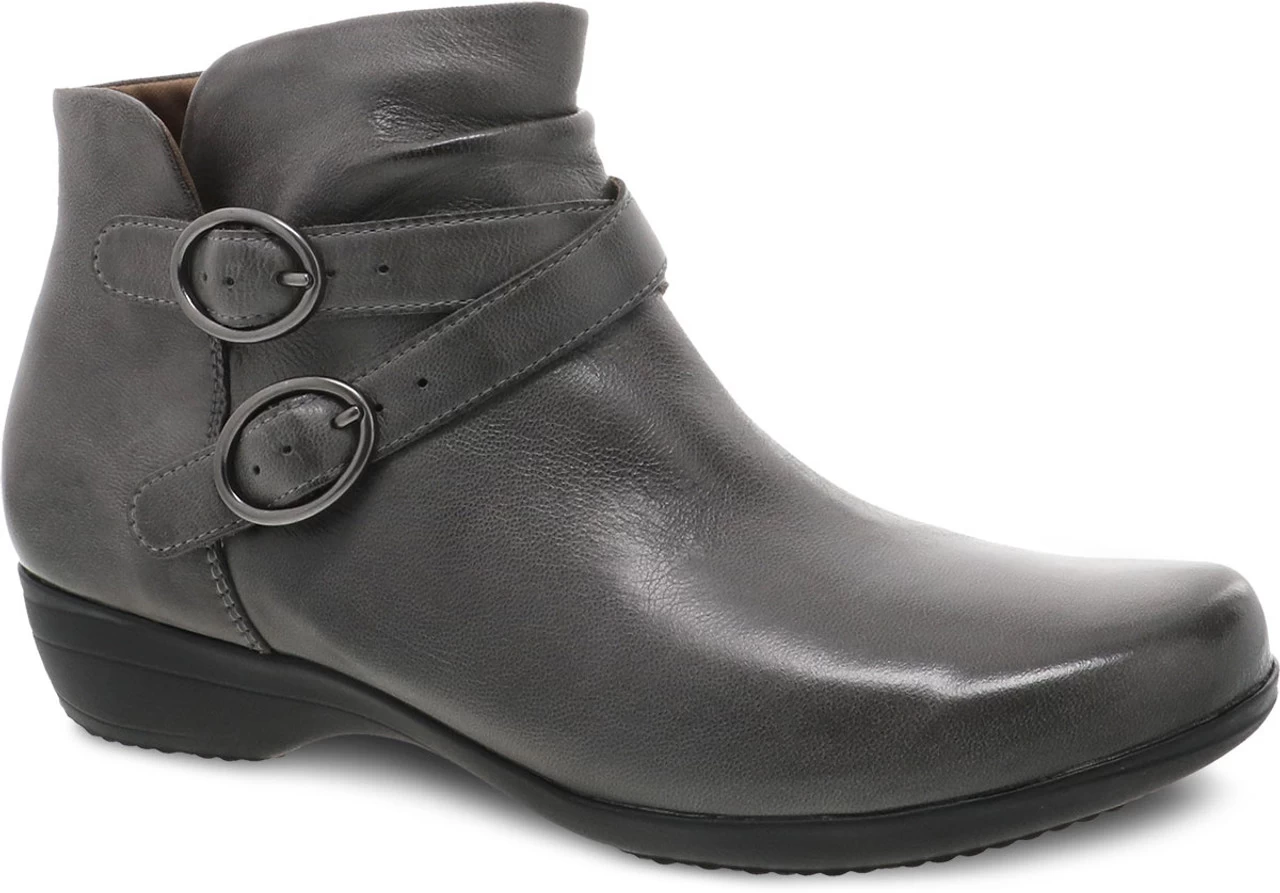 Englin’s Fine Footwear presents the women’s ‘Faithe’ from Dansko. Faithe is a slip on ankle bootie with an inside zip and double adjustable buckles, soft leather and textile linings for all-day comfort, a removable, molded EVA footbed with Dansko Natural Arch technology for support and cushioning, and a rubber outsole for long-lasting wear.