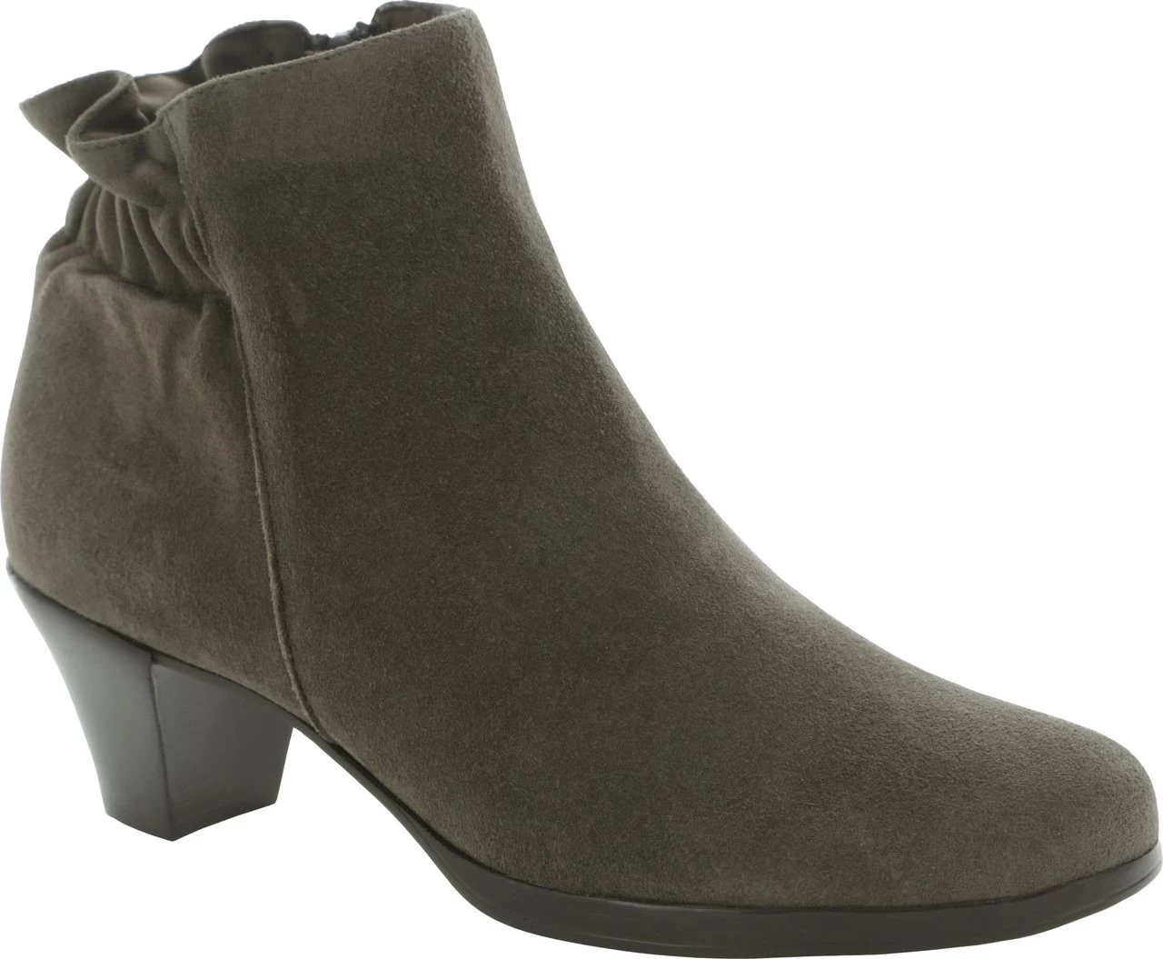 Englin’s Fine Footwear presents the women’s ‘Alfie’ from Munro. Classy and fashionable ankle boot with ruching on back of ankle. The goat suede has been treated for water resistance. The inside zipper makes for easy on and off. Comfortable bootie that will complete your ensemble.