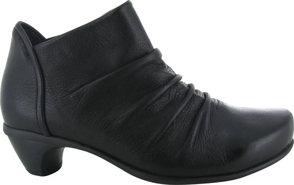 Englin’s Fine Footwear presents the ‘Advance’ from Naot. The Advance is a low boot with a fashionable rouched upper. The Advance has an inside zipper for accessibility, a padded heel cup & slightly padded upper. This style has a 3.25″ shaft. Naot’s anatomic cork & latex footbed is wrapped in pampering suede and molds to the shape of the foot with wear. The Avantgarde Collection features a 2″ TPR sole with a metal shank. Narrow to medium fit.