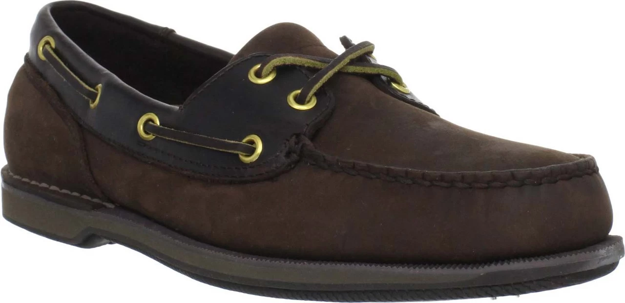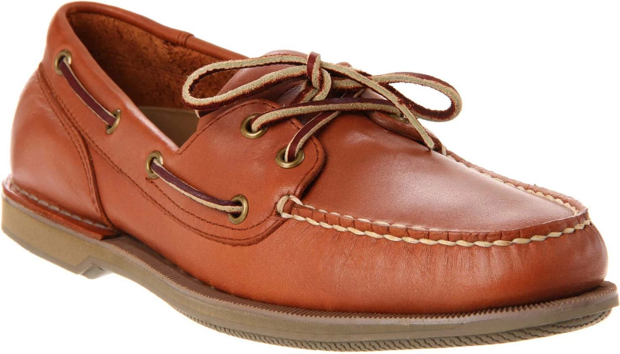 - Leather upper in a boat shoe slip-on style with a round, moc stitched toe