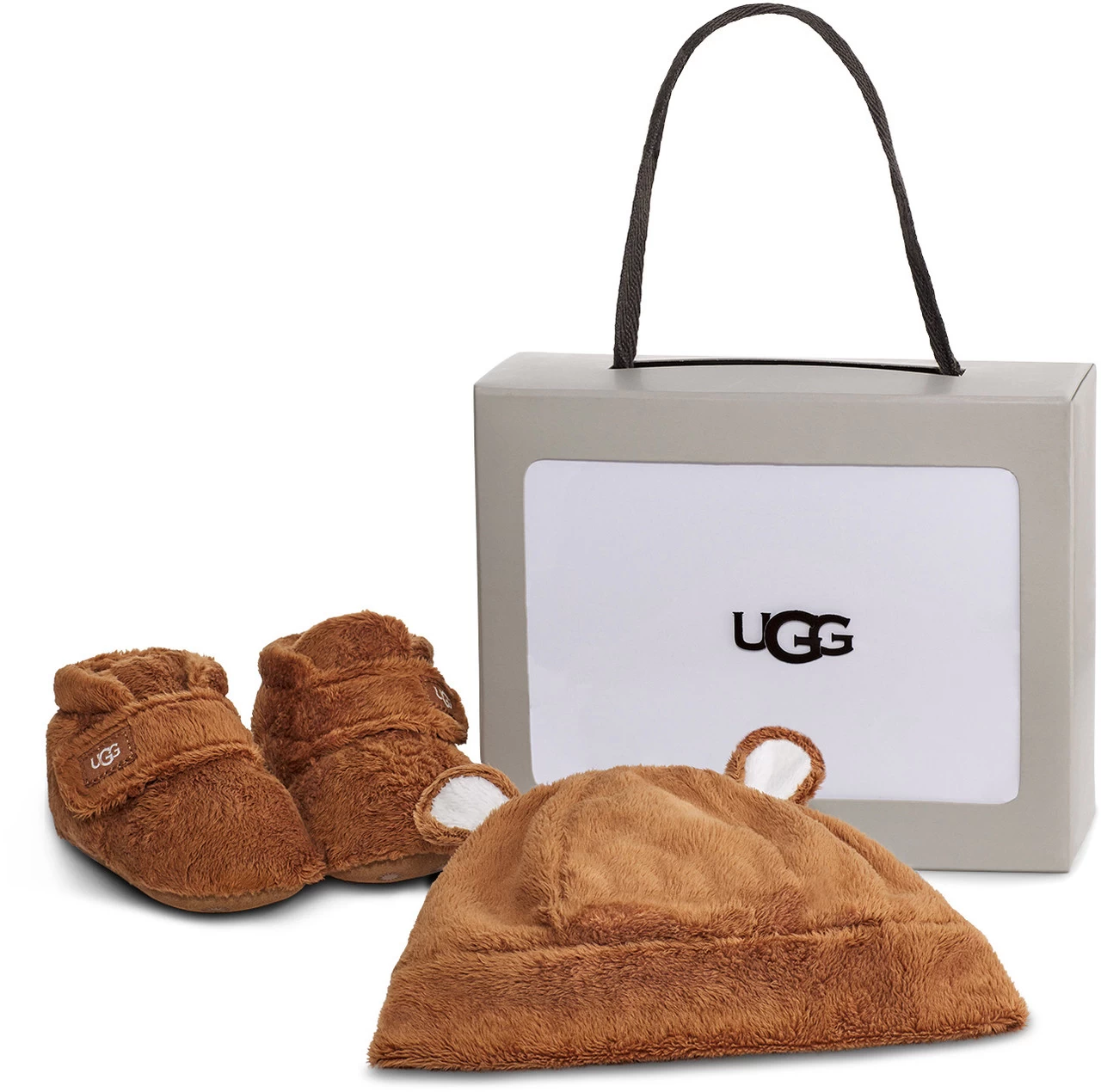 Englin’s Fine Footwear presents the infant’s ‘Bixbee and Beanie’ from UGG. This snug combination features our customer-favorite Bixbee and an adorable matching teddy bear beanie to keep your baby cozy from head to toe. Featuring an easy hook-and-loop closure, the machine-washable bootie wraps the littlest of feet in soft fleece with slip-resistant rubber print to assist their first steps, while the beanie is just plain cute.